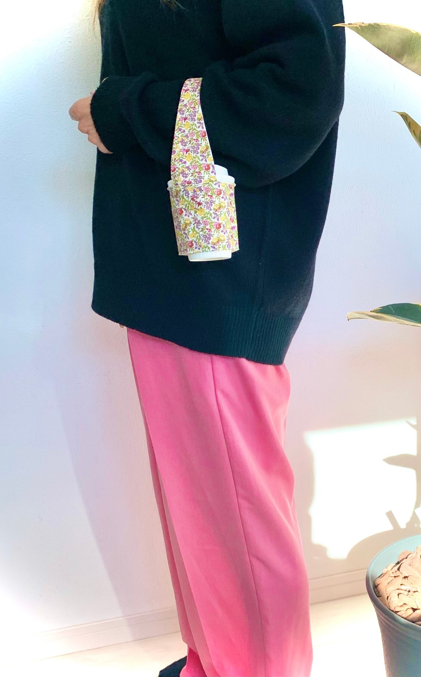 小花柄リバティのホットドリンクホルダーです。